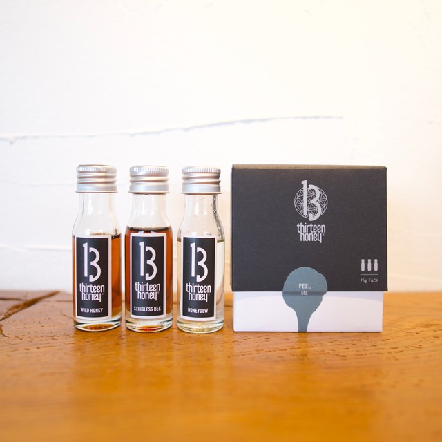 13HONEY の3種類(ワイルドハニー、スティングレスビー、ハニーデュー)が、 25gのミニサイズになってセットになりました。 どれも少しだけ試してみたい方に プレゼントにも また 外出用の持ち歩き用にも ぜひご活用ください。 ※箱に、保管上ついた汚れがある場合がございます。 ご了承いただきますようお願い申し上げます。 ※賞味期限は内箱の、表・裏どちらかに印字がございます。 上記 ご留意の上お申込みください。 内容量 ・ワイルドハニー 25g x 1 ・スティングレスビー 25g x 1 ・ハニーデュー 25g x 1 注意事項 はちみつは白く結晶化することがありますが、特性によるものですので品質には問題ありません。 また、はちみつは天然の産物のため、気象条件や採蜜状況などにより同じ植物から採取した場合でも色が違う場合があります。 サイトの写真と全く同じ色での商品お届けではないことをご了承ください。 製品の中の黒い粒は、はちみつ由来のものですので安心してお召し上がり下さい。 はちみつは1才未満の乳児には、食べさせないよう気をつけてください。