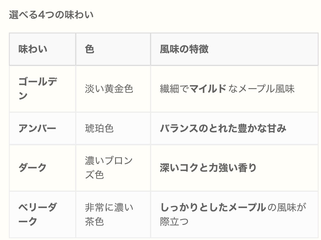特に、メープルに含まれる樹の香り成分(バニラ、木質香)が際立つため、メープルシロップらしい深みのある味わいを楽しめます。